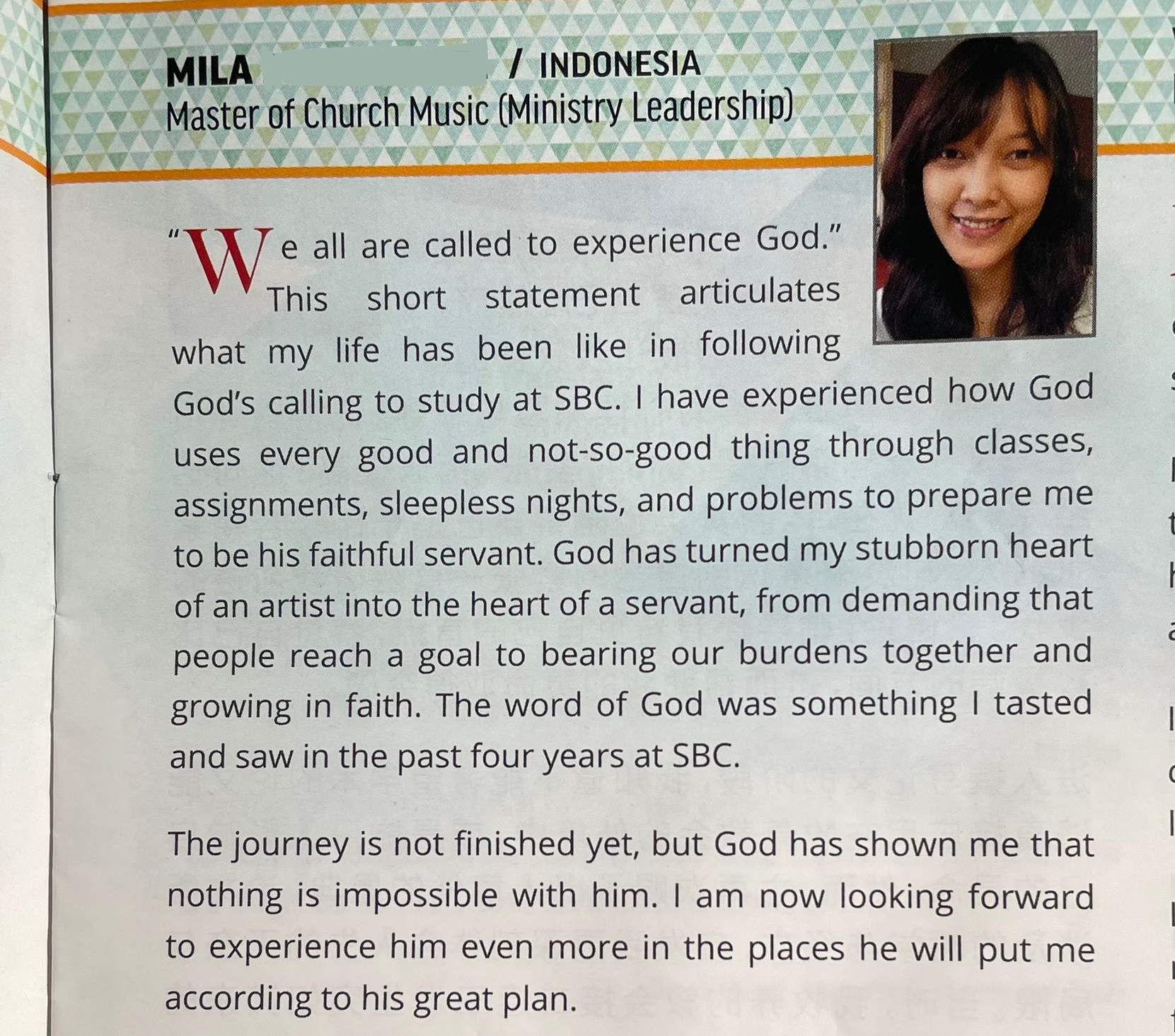 “We are all called to experience God.” This thought came to me around three years ago during my final year at the seminary. Although I wasn’t sure what it meant at the time, I knew it was what God wanted me to reflect on as I approached the end of my four-year study. Three years later, I was guided by the Holy Spirit to prepare teaching material from 1 John 1:1-3, and it was only then that I remembered what I had written.